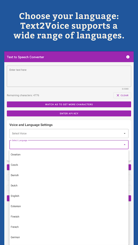 Experience the power of AI-driven speech synthesis with Text2Voice. Whether you're a content creator, language enthusiast, or someone who needs text-to-speech functionality, our app delivers high-quality, natural-sounding voice output.