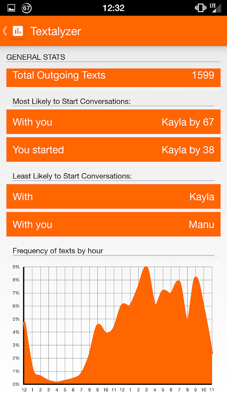 • Stats are not gathered from ANY external texting application such as Whats App, Google Hangouts, Viber, TextSecure, Facebook, etc. These sources don't have public APIs and generally don't store the texts on the phone itself making it unreasonable to expect.