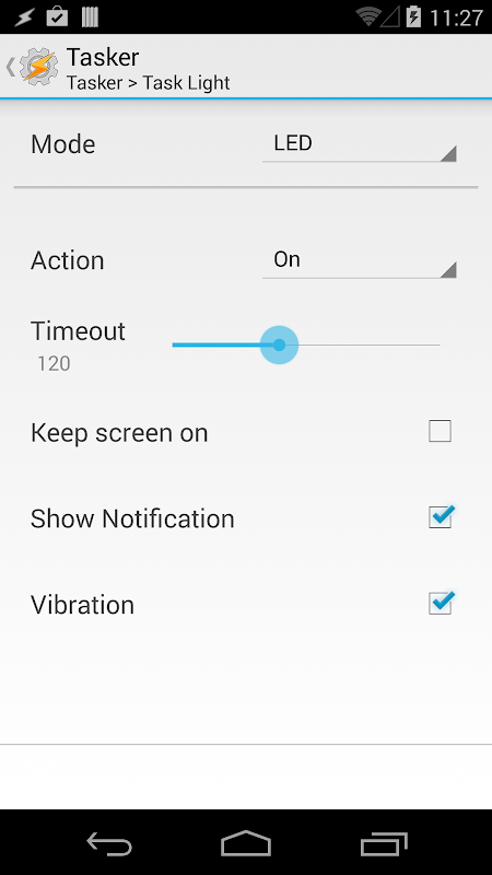 - Timeout, Vibrate, Light Notification, Colors, Testing option