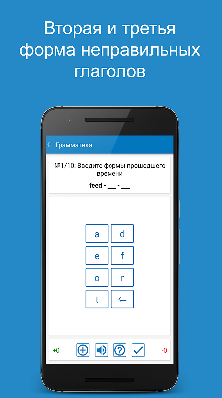 В режиме изучения неправильных глаголов выводится мини-клавиатура для ввода форм прошедшего времени.