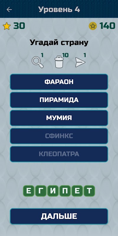 Игра разделена на различные категории. Изначально открыты три из них, но по мере прохождения можно зарабатывать очки и открывать новые. Примеры категорий: страны, события, фильмы, сериалы и другие.