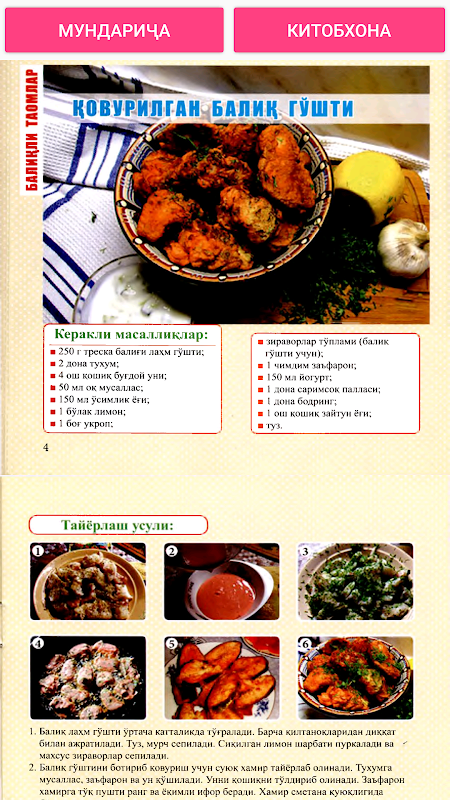 1. Балиқ гўшти бўлаклари ювилади. Зираворлар сепиб аралаштирилади. Лимон тент