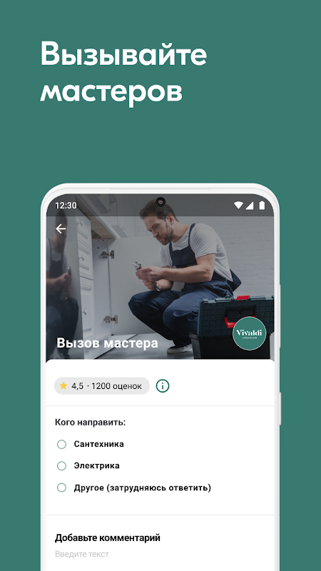 • Вызывать мастера, следить за статусом заявки, общаться в чате и оценивать качество работы;