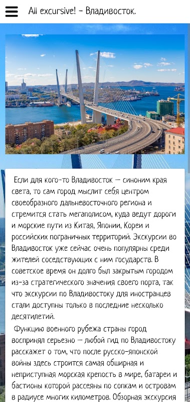 ในแอปพลิเคชั่นนี้ คุณสามารถทำความรู้จักกับ Vladivostok เบื้องต้น เลือกสถานที่ท่องเที่ยวโดยดูจากสถานที่ท่องเที่ยวและวิดีโอรีวิว แอปพลิเคชั่นนี้ยังมีข้อมูลเกี่ยวกับสำนักงานการท่องเที่ยวและโรงแรมที่ให้บริการในวลาดิวอสต็อก