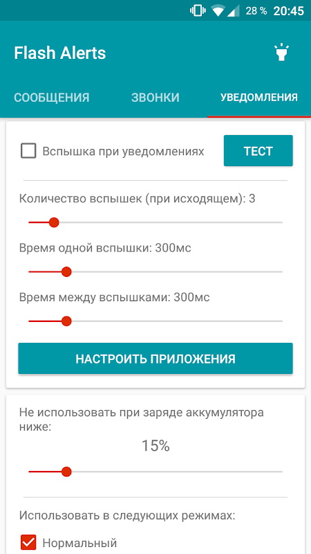 + Настройка выключения вспышки при определенном заряде батареи, а так же при определенном режиме звука (бесшумный, вибрация, нормальный)