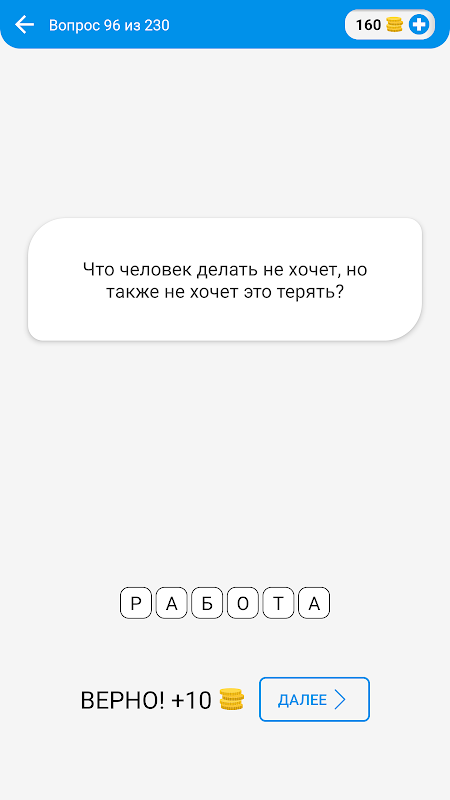• ระบบคำแนะนำ: ใช้คำแนะนำหากคุณติดขัด: เปิดจดหมาย ลบตัวอักษรเพิ่มเติม หรือแสดงคำตอบ สามารถซื้อคำใบ้ได้ด้วยเหรียญ ซึ่งจะได้รับจากการเอาชนะเกมหรือลงชื่อเข้าใช้แอปทุกวัน