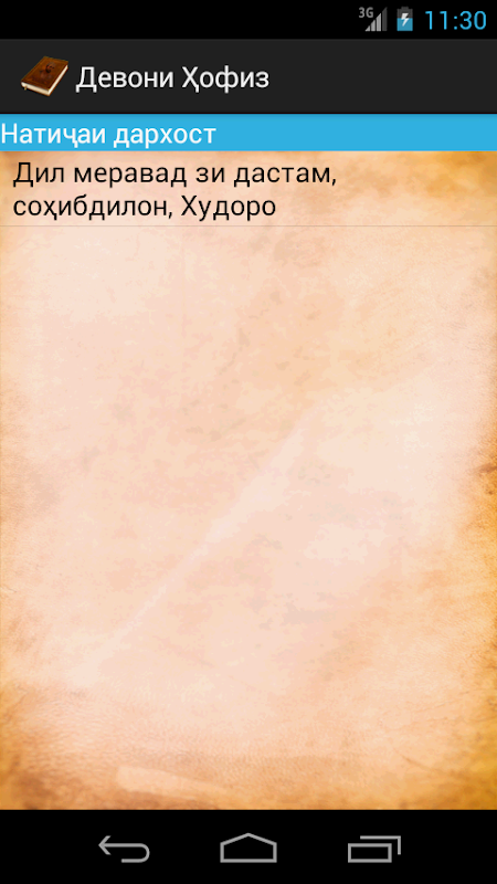 แอปพลิเคชั่นนี้มี Diwan (คอลเลกชันของบทกวี) ของกวีชาวเปอร์เซียที่ไม่มีการเปลี่ยนแปลง Khoja Shamsiddin Muhammad Hafizi Shirazi (ฟาร์ซี: خواجهشمسالدینمحمدحافظشیرازی) ผลงานที่สมบูรณ์ของเขาถือเป็นปีกของวรรณกรรมเปอร์เซียและสามารถพบได้ในบ้านของคนส่วนใหญ่ในอิหร่านทาจิกิสถานและอัฟกานิสถานซึ่งเรียนรู้บทกวีของเขาด้วยใจและใช้เป็นสุภาษิตและคำพูดจนถึงทุกวันนี้ ชีวิตและบทกวีของเขาเป็นเรื่องของการวิเคราะห์ข้อคิดและการตีความมากมายซึ่งมีอิทธิพลต่อการเขียนภาษาเปอร์เซียหลังศตวรรษที่สิบสี่มากกว่าผู้เขียนคนอื่น ๆ