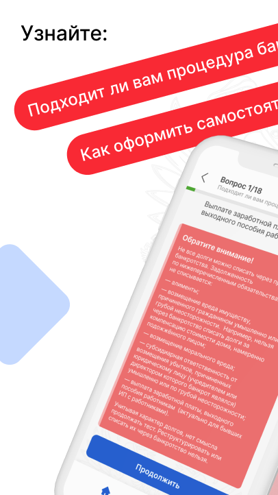 แอปปิดหนี้ของคุณ - แอปล้มละลายส่วนบุคคลช่วยให้คุณเข้าใจว่าการล้มละลายเหมาะสมกับคุณหรือไม่ บริการนี้ช่วยให้คุณค้นหาหนี้ จัดการขั้นตอนในการตัดหนี้และรับคำแนะนำทางกฎหมายออนไลน์อย่างอิสระ แอปพลิเคชั่นนี้มีการทดสอบ ซึ่งคุณจะได้ทราบในหนึ่งนาทีว่าคุณสามารถล้มละลายได้โดยไม่ได้รับความช่วยเหลือจากภายนอก