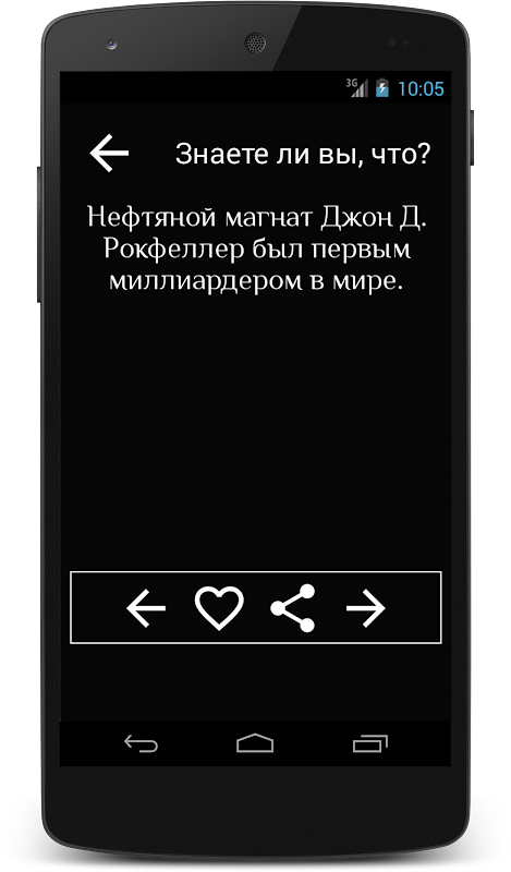 Нашли что-то интересное – поделитесь с друзьями любым фактом через социальные сети и мессенджеры. Простой и приятный интерфейс, ничего лишнего, удобный скролинг по интересным фактам, возможность добавлять в избранное и скопировать в буфер.