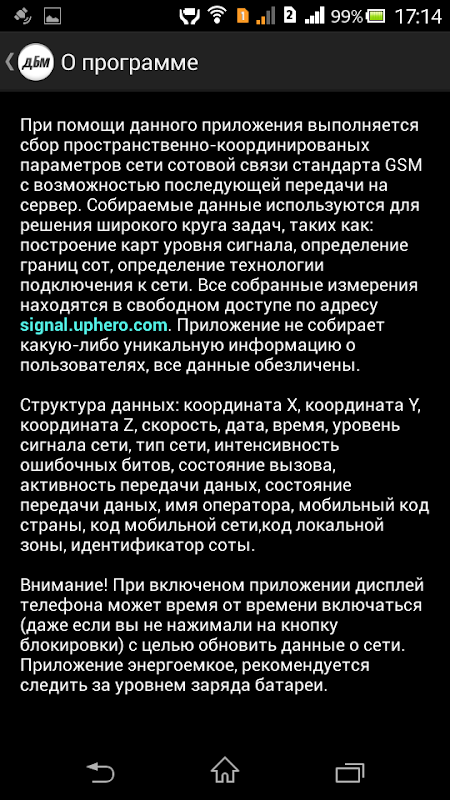 Внимание! При включенном приложении дисплей телефона может время от времени включаться (даже если вы не нажимали на кнопку блокировки) с целью обновить данные о сети. Приложение энергоемкое, рекомендуется следить за уровнем заряда батареи.