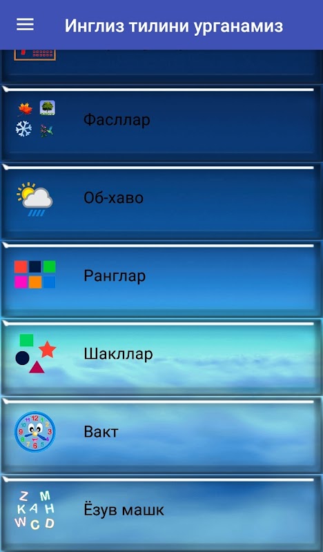 Bu dastur orkali siz ingliz tili harflari, sonlari, ranglar, oylar, shaklar wa boshkalarni urganishingiz mumkin. มากกว่า Har bir harf wa suz uchun alohida tovush โยซิลกัน