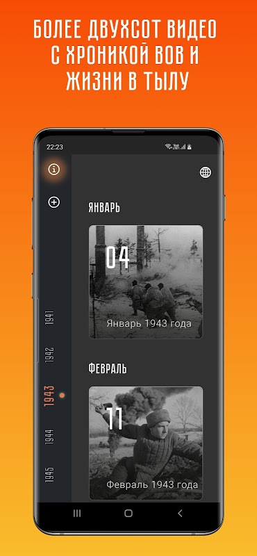 * วิดีโอพงศาวดารของ Great Patriotic War แอปพลิเคชั่นมีวิดีโอมากกว่า 250 รายการและจำนวนจะเพิ่มขึ้นในอนาคต วิดีโอทั้งหมดถูกจัดเรียงตามปีและเดือนเพื่อให้ง่ายต่อการศึกษาตามลำดับเวลา
