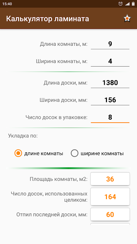 Приложение Калькулятор ламината (расчет ламината) позволяет рассчитать количество ламината, нужное для укладки на пол. Калькулятор учитывает способ укладки: прямой, диагональный. Для расчета вам достаточно ввести размеры помещения, а также доски ламината. Вы можете узнать не только количество упаковок ламината, но также количество досок использованных целиком, количество неиспользованных досок.