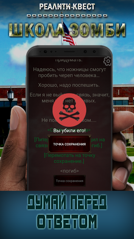 "Школа Ходячих Мертвецов" - это книга-игра, про подростков, которые оказались в эпицентре зомби катастрофы. Главный герой игры испуганный и отчаявшийся подросток чудом выходит на контакт с Вами и просит о помощи. Его школу охватили зомби и ему некуда бежать.