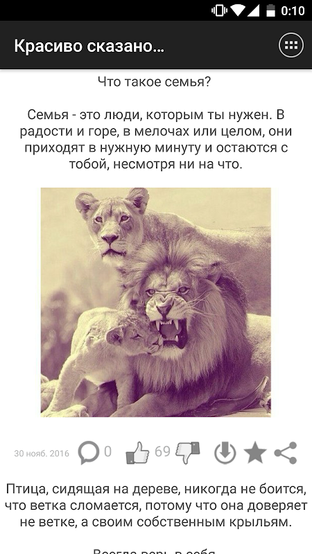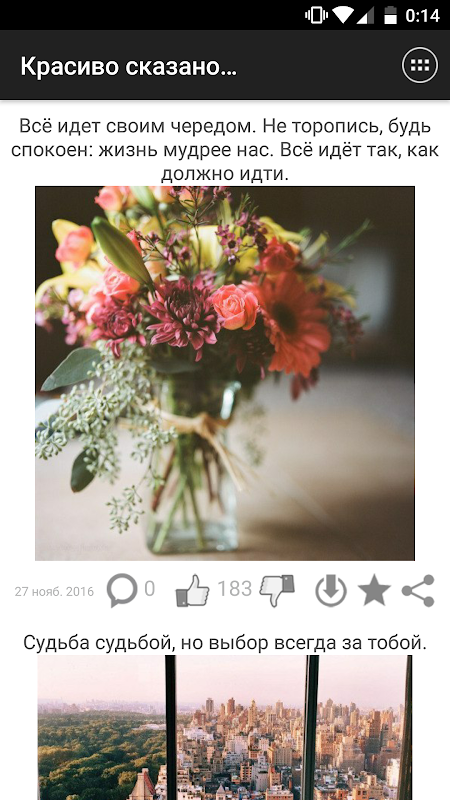 Понравившиеся записи можно комментировать и оценивать. Все понравившиеся картинки можно сохранять в галерее устройства в папке приложения. Ты можешь делиться записями с друзьями через социальные сети Facebook, Вконтакте, Одноклассники, Viber, WhatsApp а так же другие установленные на устройстве приложения. Ну и конечно, ты можешь оставлять лайки и сохранять записи в избранное.