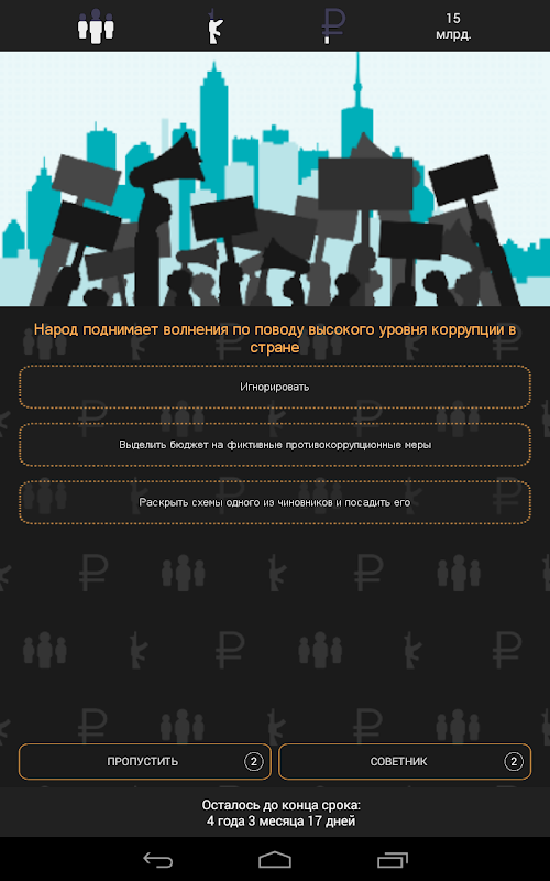 ในเกมคุณสามารถลองด้วยตัวเองในบทบาทของประธานาธิบดีที่ลดงบประมาณของรัฐ เราเข้าใจว่าในโลกแห่งความเป็นจริงมันเป็นสิ่งที่คิดไม่ถึง แต่นี่เป็นเกม