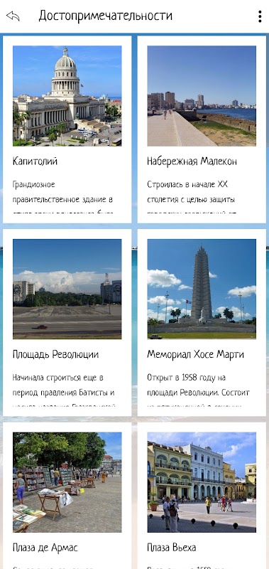 มีบางครั้งที่คุณเดินทางคนเดียวหรือเป็นคู่ และคุณต้องการไปทัศนศึกษาที่น่าสนใจในคิวบา แต่ก็มีราคาแพง เนื่องจากไกด์เรียกเก็บค่าธรรมเนียมแบบกลุ่ม ในแอปพลิเคชั่นนี้ คุณสามารถค้นหาเพื่อนนักเดินทางสำหรับการทัศนศึกษาร่วมกัน และลดต้นทุนของทัวร์ ในส่วน "เพื่อนร่วมเดินทาง" ของแอปพลิเคชัน เผยแพร่โพสต์ของคุณและผู้ใช้แอปพลิเคชันรายอื่นจะมองเห็นได้ภายในรัศมี 10 กิโลเมตร และเมื่อคุณคลิกที่ไอคอน "ตำแหน่งทางภูมิศาสตร์" คุณจะเห็นข้อเสนออื่น ๆ ดังกล่าวภายในรัศมี 10 กิโลเมตรจากคุณ! นอกจากนี้ ในแอปพลิเคชันนี้ คุณยังสามารถทำความคุ้นเคยกับเมืองต่างๆ ของคิวบาในเบื้องต้น เลือกสถานที่ท่องเที่ยวโดยดูจากสถานที่ท่องเที่ยวและวิดีโอรีวิว แอปพลิเคชั่นนี้ยังมีข้อมูลเกี่ยวกับบริษัททัวร์ ตัวแทนท่องเที่ยว และโรงแรมที่ให้บริการในเมืองที่เลือก