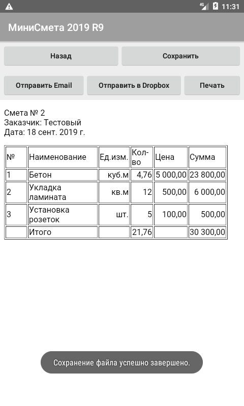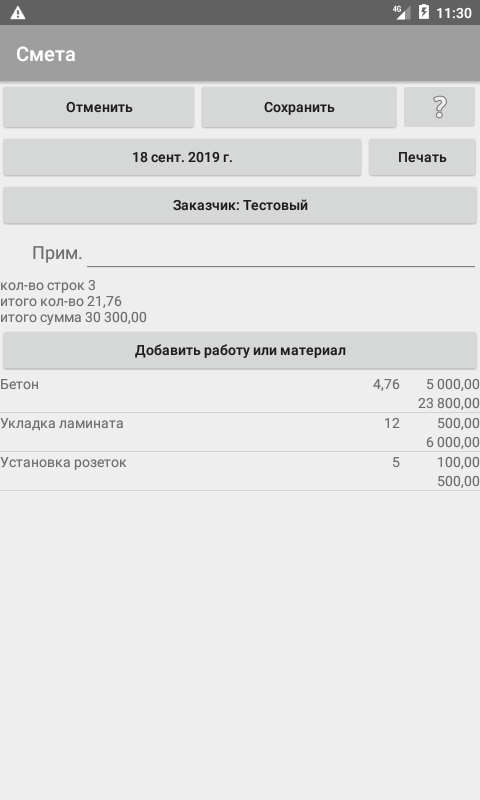 หากคุณคาดหวังว่าโปรแกรมจะมีกรอบการกำกับดูแลและสิ่งที่คล้ายกัน แสดงว่าโปรแกรมนี้ไม่เหมาะกับคุณ โปรแกรมนี้เหมาะสำหรับผู้ที่พร้อมที่จะเพิ่มรายการบริการและเนื้อหาลงในโปรแกรม สำหรับแต่ละรายการในรายการนี้ จะมีการระบุราคาและหน่วยการวัด การมีรายการสำเร็จรูปในโปรแกรมคุณสามารถสร้างประมาณการได้อย่างง่ายดาย ในการดำเนินการนี้ คุณเพียงแค่ต้องเลือกบริการหรือวัสดุจากรายการและระบุปริมาณ (ปริมาตร) ที่ต้องการ ราคาในการประมาณการจะถูกป้อนจากรายการ หากจำเป็น สามารถระบุราคาอื่น ๆ ในการประมาณการเฉพาะได้ หลังจากร่างและบันทึกประมาณการแล้ว สามารถพิมพ์หรือบันทึกเป็นไฟล์และส่งให้ลูกค้าทางอีเมลได้