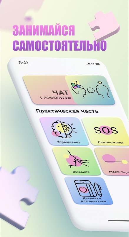 ประกอบด้วยหลักสูตรที่สร้างและทดสอบโดยนักจิตวิทยาผู้มากประสบการณ์ แบบฝึกหัดที่ชัดเจน ความช่วยเหลือ SOS "ทันที" ไดอารี่ และนักจิตวิทยา AI รุ่นใหม่พร้อมการสนับสนุนตลอด 24 ชั่วโมงทุกวัน ไม่มีศัพท์เฉพาะที่ซับซ้อน แต่เป็นสิ่งที่ใช้ได้ผลในทางปฏิบัติ