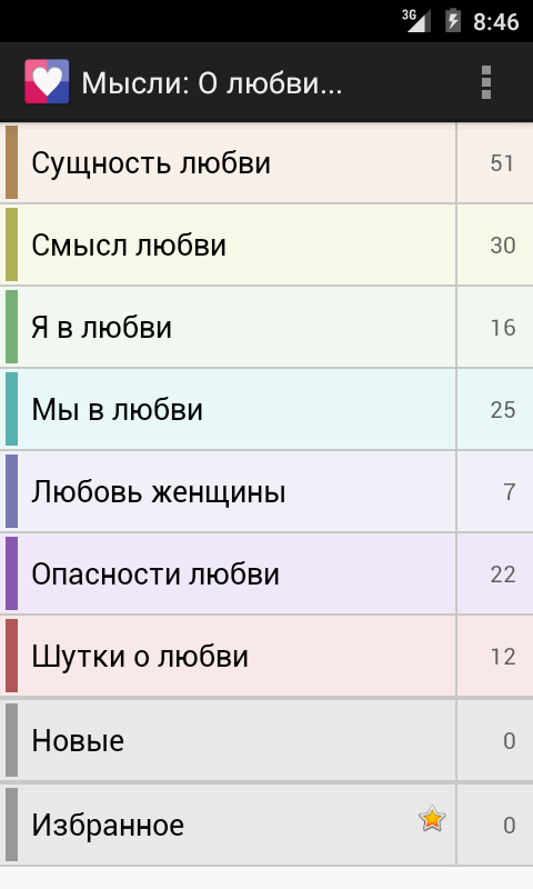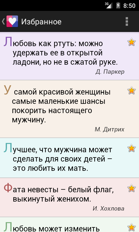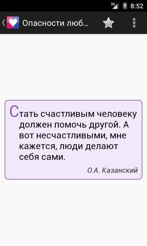 แอพลิเคชันที่มีคอลเลกชันที่มีโครงสร้างของความคิดและคำพูดเกี่ยวกับความรักการอ่านซึ่งจะช่วยให้ดูดีขึ้นสาเหตุของปัญหาที่เกิดขึ้นในความสัมพันธ์ที่จะเข้าใจคนที่คุณรักให้ความสัมพันธ์ที่สดใสและอากาศอบอุ่น คุณจะไม่พบคำตอบสำเร็จรูปคำถามของพวกเขา แต่ได้รับ "อาหารสำหรับความคิด" และบางทีอาจจะหาเบาะแสที่จะแก้ปัญหาของพวกเขา เครื่องมือที่จะช่วยให้คุณเพลิดเพลินไปกับทุกวันบิตคนแปลกหน้าของภูมิปัญญา