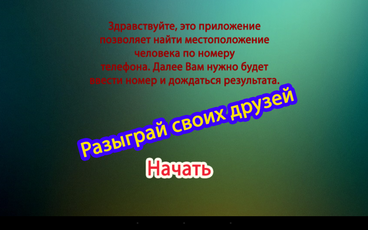 Ты когда-нибудь хотел пошутить над другом? Или узнать местоположение своей девушки? Надоело ломать голову? Тогда это приложение точно для тебя! Всего в пару действий и Ты можешь получить доступ ко всей информации абсолютно бесплатно. Приложение имитирует поиск местоположения по номеру. Подшути над друзьями и покажи свои хакерские навыки.