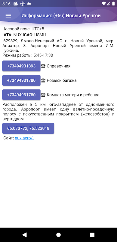 แอปพลิเคชั่นอย่างไม่เป็นทางการที่ให้ข้อมูลเกี่ยวกับสถานะการออกเดินทางและการมาถึงของเครื่องบินที่สนามบินใน Novy Urengoy เป็นไปได้ที่จะขยายเส้นบอกคะแนนเป็นหน้าจอข้อมูลเพิ่มเติม