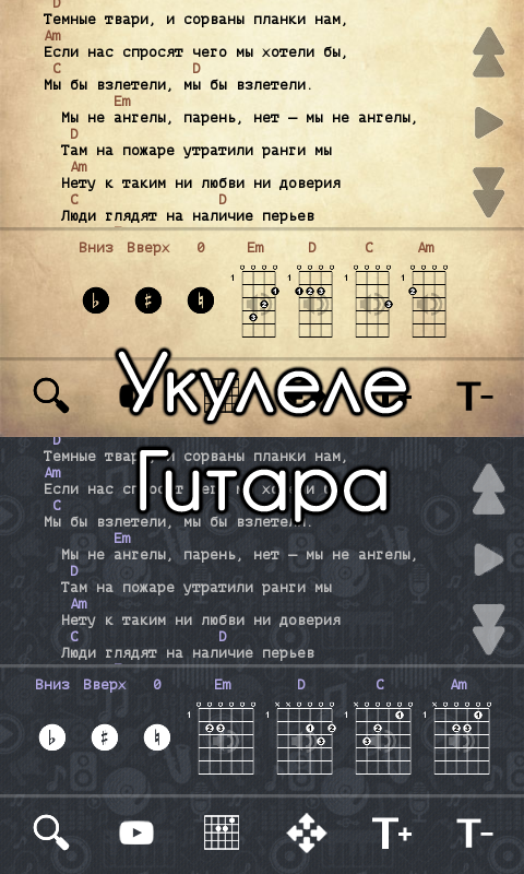 - เนื้อเพลงมากกว่า 8300 เพลง (ในรัสเซีย, ยูเครนและเบลารุส) พร้อมคอร์ดกีตาร์และอูคูเลเล่