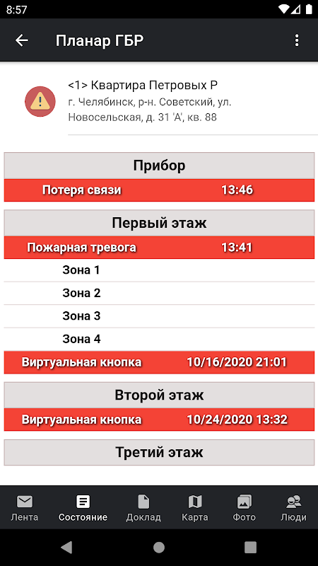 Приложение отслеживает состояние охраняемых объектов и, при получении и подтверждении тревоги, отображает основную информацию об объекте: