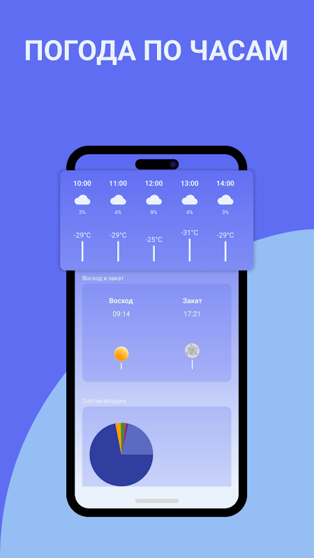 แอพพยากรณ์อากาศให้รายละเอียดการพยากรณ์อากาศและการพยากรณ์อากาศทั่วโลก แอพให้อุณหภูมิปัจจุบันเป็นเซลเซียสและฟาเรนไฮต์ เวลาพระอาทิตย์ขึ้นและตกตามโซนเวลาของเมือง
