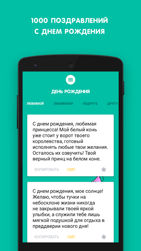 Вы никогда не будете повторяться, а понравившиеся поздравления сможете сохранять в избранном и использовать их в нужный момент. Отправить поздравления можно прямо из приложения. Доступ к базе поздравлений бесплатен, а приложение можно использовать даже без интернета.