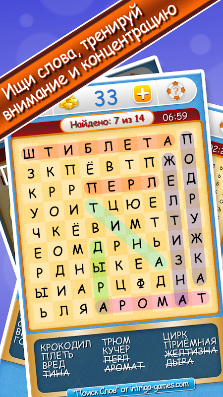 - Польза: поиск слов отлично тренирует внимание и концентрацию. Развивает зрительную память. Просто приятное времяпрепровождение с пользой.