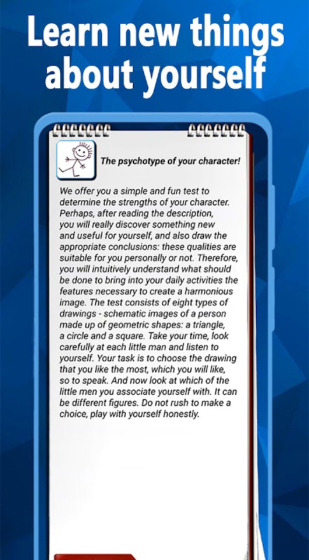 ดูแอปพลิเคชันและค้นหาจุดแข็งของตัวละครของคุณ เป็นคนแบบไหนที่คุณรัก ความสัมพันธ์ในที่ทำงานและกับคนรอบตัวคุณ มีการทดสอบฟรีที่ไม่ซ้ำใครมากกว่า 20 รายการให้คุณทราบ นี่คือการทดสอบทางจิตวิทยาที่น่าสนใจและฟรีที่สุด: