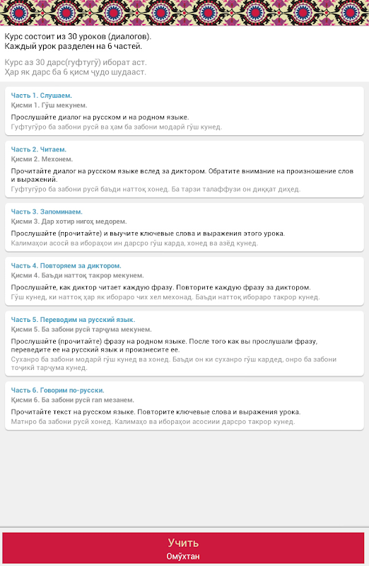 Программа курса состоит из 30 уроков, которые подразумевают освоение материала через диалоги (слушаем аудио и повторяем) и текстовые транскрипции (читаем и запоминаем) с возможностью проверки полученных знаний в конце каждого урока.
