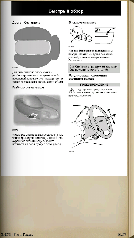 Стоит отметить, что мануал очень удобен в использовании, поскольку разбит на главы и темы, содержащие основные сведения по техническому устройству, использованию различных функций, обеспечивающих комфортную езду и безопасность в салоне. К тому же, текстовой материал подкреплен графическими изображениями, схемами и цифровыми обозначениями.