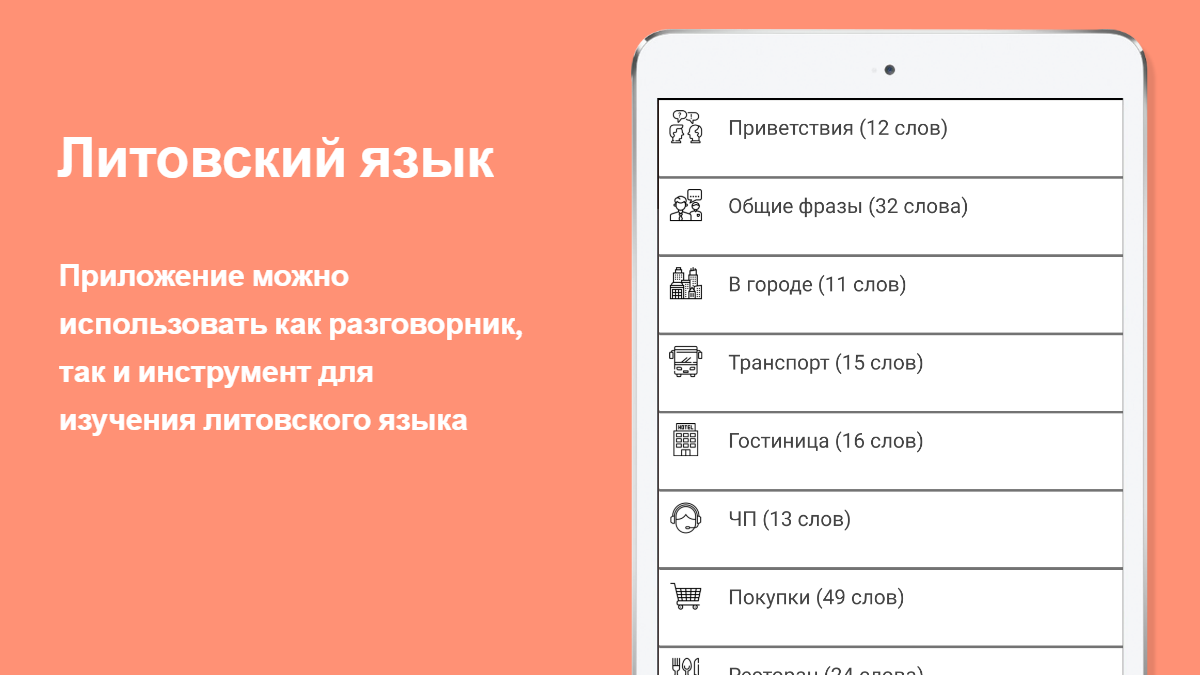 คุณสามารถใช้วลีภาษารัสเซีย - ลิทัวเนียตามลำดับเป็นวลีและเป็นเครื่องมือในการเรียนรู้ภาษาลิทัวเนีย คำศัพท์ภาษาลิทัวเนียทั้งหมดเขียนด้วยตัวอักษรรัสเซียและแบ่งออกเป็นหัวข้อเชิงตรรกะ 20 หัวข้อนั่นคือวลีนี้ออกแบบมาสำหรับผู้ใช้ที่พูดภาษารัสเซีย (นักท่องเที่ยว)