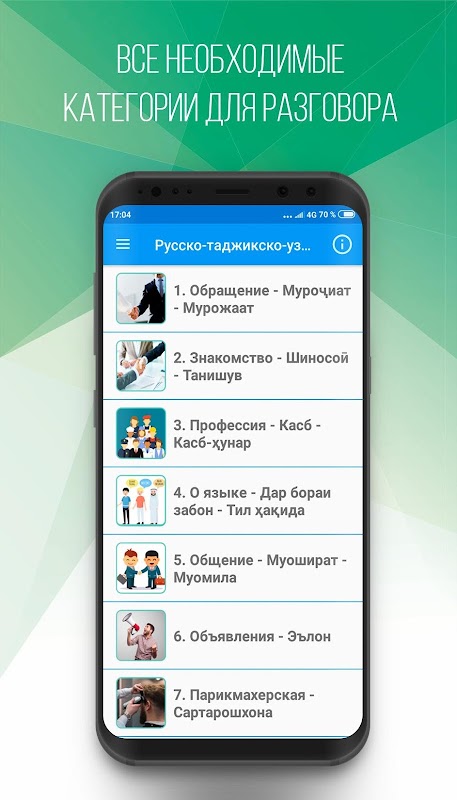 Phrasebook เป็นผู้ช่วยที่ดีสำหรับผู้ที่รู้ภาษารัสเซีย / ทาจิก / อุซเบกและเป็นเพื่อนที่ขาดไม่ได้สำหรับทุกคนที่เพิ่งเริ่มเรียนรู้ภาษา วลีนี้ทำงานได้อย่างสมบูรณ์โดย ไม่ต้องเชื่อมต่ออินเทอร์เน็ต
