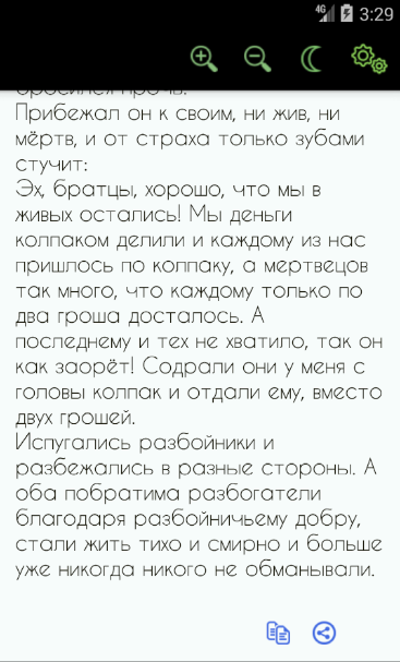 Приложения запоминает, где вы остановились для каждой категории. Благодаря этому вы сможете позже возобновить чтение с того же места.Есть возможность поделиться сказкой.