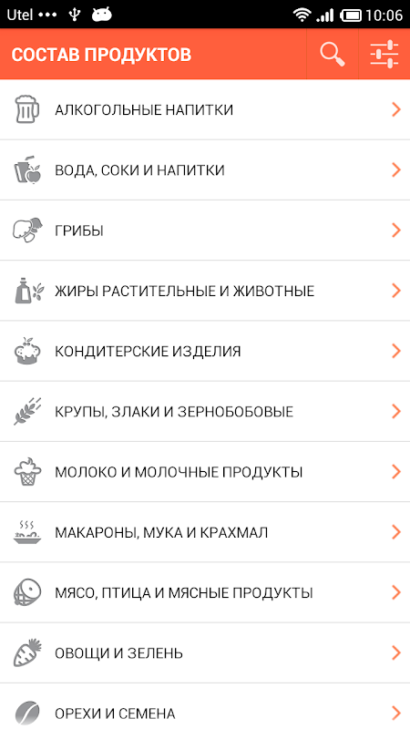 • Можно сортировать продукты по содержанию в них выбранного нутриента;