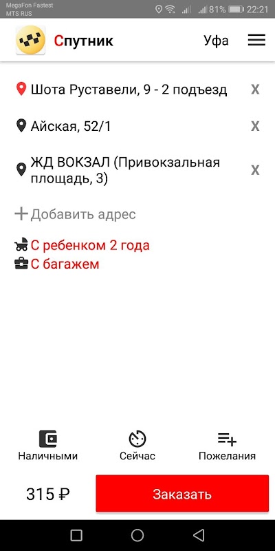 Sputnik - จองรถแท็กซี่, อูฟา แอพลิเคชันสำหรับการสั่งซื้อรถแท็กซี่และจัดส่งไปยังเมืองอูฟา