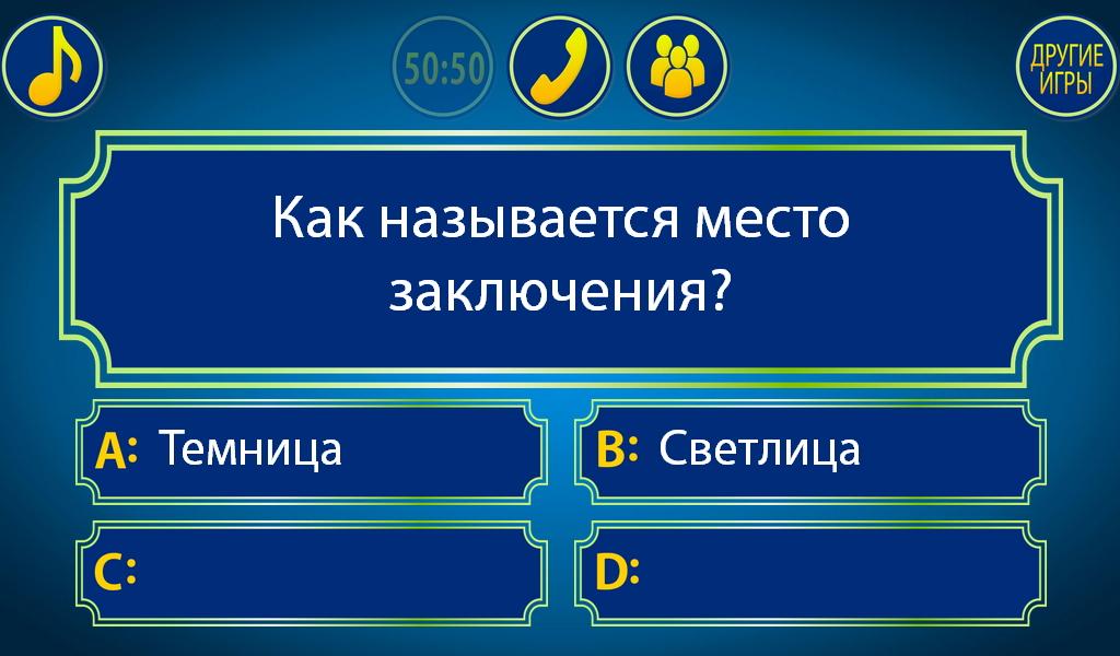 Самая новая и интересная игра миллионер, в которой вы можете стать миллионером, перед вами! В этой игре необходимо пройти 15 уровней, в которых отгадать 15 вопросов из различных областей знаний и заработать целый миллион!