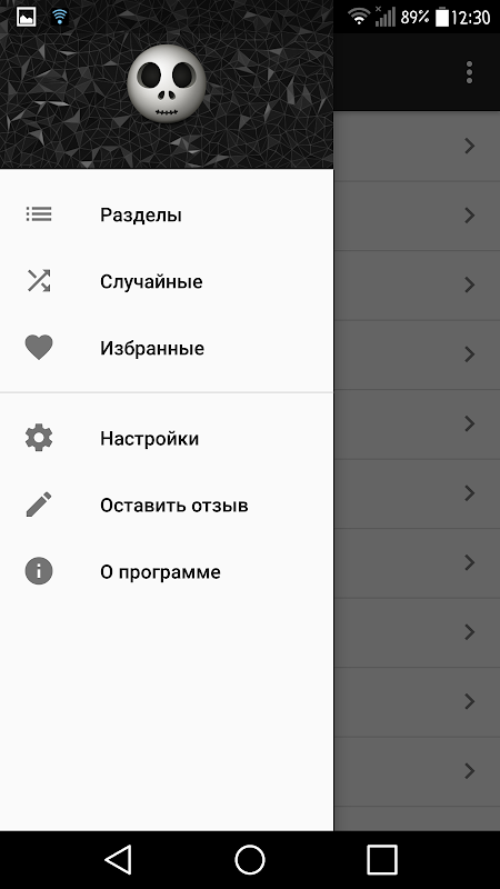 Разделы страшных историй содержащиеся в приложении: