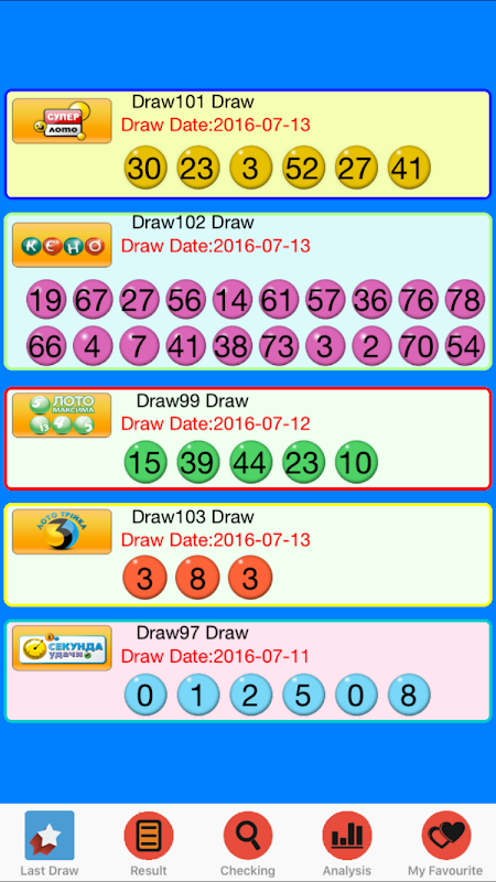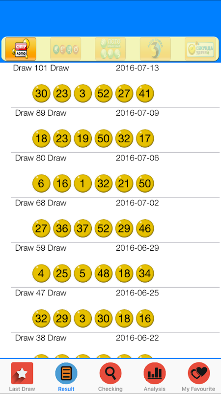 - За останні 30 минулі результати розіграші Супер Лото, Кено, Лото Максима, Loto Triyka, по-друге удачі.