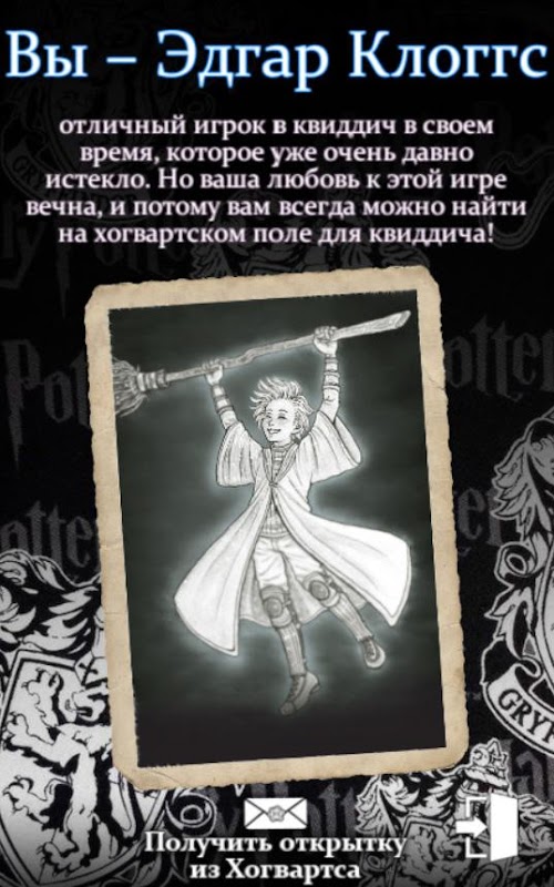Восемь таинственных призраков школы волшебства и чародейства ждут тебя в темных подземельях и высоких башнях. В каком из них ты узнаешь себя? Открой тайну и получи коллекционную открытку! Расскажи друзьям, играйте в наш тест – квест вместе и выясните, кто из вас быстрее сможет разгадать загадки всех привидений знаменитой школы магии!