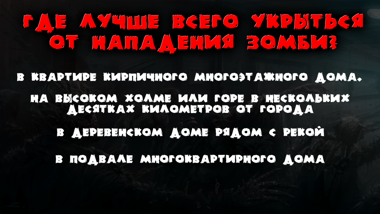 Для того, чтобы создать этот тест, мы посмотрели огромное количество фильмов про зомби, прочитали книжки и даже обратились к профессиональным спецназовцам, чтобы они пофантазировали на тему выживания в условиях зомби-апокалипсиса. В общем, дерзайте! Но не забывайте, что вопросы могут быть с подвохом. Хорошенько обдумайте прежде, чем выбрать ответ.