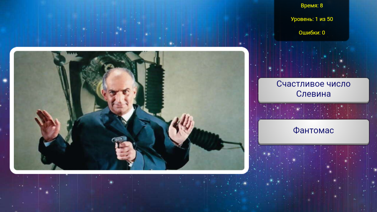 Вам будет дана 1 картинка из фильма вы должны будете выбрать 1 верный вариант из 2 предложенных. За неверный ответ будет начисляться время 5 секунд к вашему таймеру, поэтому у вас будет стимул чтобы не ошибиться и пройти все уровни без ошибочно, после вы можете просмотреть свой рейтинги и узнать вашу оценку о знании киноленты. Играйте еще раз, чтобы увеличить количество сыгранных игр в рейтинге и выйти на новый уровень эрудиции в знаниях различных фильмов!