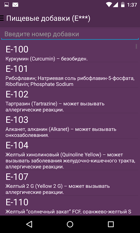 Или например вы видите на бутылке кока колы какие то не понятные Е-шки, заходите в приложение, открываете раздел "Е добавки" и вбиваете в поиске номер добавки и видите что она значит.