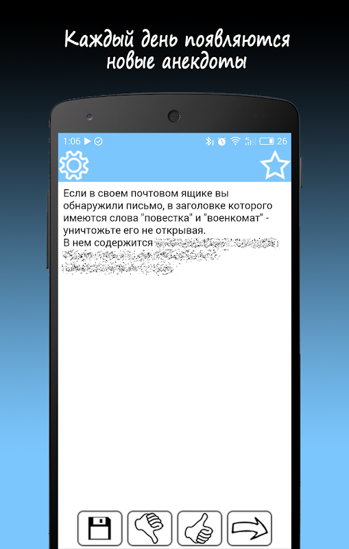 ในชั่วโมงที่น่าเบื่อ มุขตลกขนาดใหญ่ ในกระเป๋าของคุณจะทำให้คุณหัวเราะและเชียร์คุณขึ้น ไม่มีหมวดหมู่เพียงแค่เปิดแอปพลิเคชันและในลำดับแบบสุ่มบนหน้าจอจะปรากฏเป็นเรื่องเล็ก ๆ น้อย ๆ อ่าน - พลิกดู