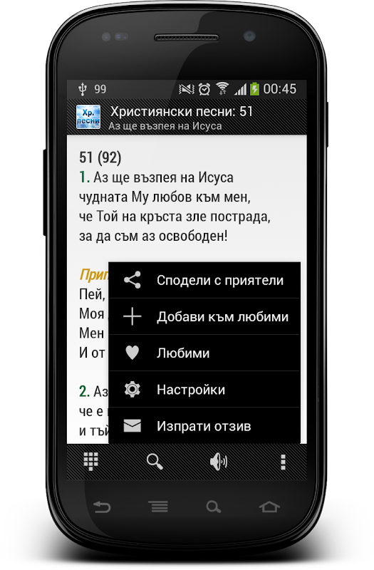 "เพลงคริสเตียน" คือชุดของเพลงสรรเสริญพระเจ้า ภาคผนวกมีบทและทำนองของเพลง 300 ทางจิตวิญญาณของวันเสาร์ Adventists ในบัลแกเรีย มีโอกาสที่จะรับฟังไฟล์เพลง, ค้นหา, เลือกและแบ่งปันเพลงโปรด