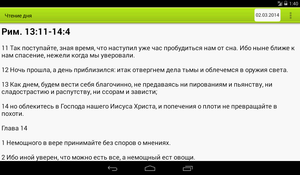 Это очень удобно, если нужно посмотреть, что написано раньше, или что сказано после сегодняшнего отрывка. Ведь иногда отрывки такие короткие, а контекст не удается вспомнить. Нужно просто нажать на ссылку в тексте "Читать далее". Также можно открыть любую книгу Библии и выбрать главу.