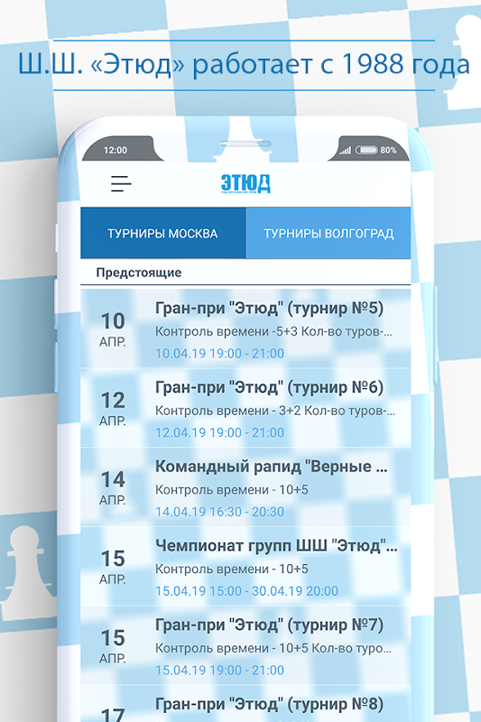 ผู้ปกครองและนักเรียน 24x7 สามารถรับผลตอบรับจากโรงเรียนหมากรุก Etude ได้ ข้อมูลจริงเกี่ยวกับกำหนดการของคลาสทัวร์นาเมนต์และกิจกรรมอื่น ๆ มีให้ในแอปพลิเคชันมือถือเสมอ แอปพลิเคชันคำนึงถึงว่าโรงเรียนดำเนินการอย่างเต็มที่ในมอสโกและโวลโกกราด ความจำเพาะของกิจกรรมในแต่ละภูมิภาค